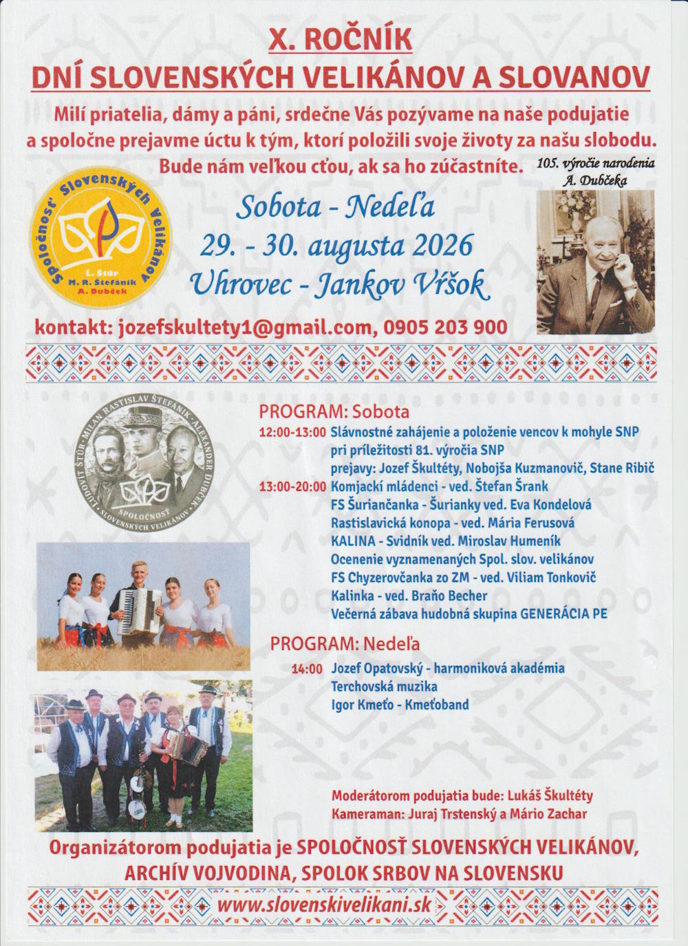 Milé členky, členovia a sympatizanti Spoločnosti slovenských velikánov (SSV), drahí priatelia. Ubehli už štyri roky, čo sme spoločne založili našu SSV v rodisku Ľudovíta Štúra a Alexandra Dubčeka, ako i rodáka z Trenčianskeho kraja Milana Rastislava Štefánika. Chceme pokračovať v tradícii Spoločnosti A. Dubčeka, ktorá zanikla a bohaté skúsenosti z domova i zahraničia, obsiahnuté aj vo významných publikáciách k jeho osobe aostatných dejateľov naplňame v praktickom živote. Okrem uctenia si ich pamiatok a narodenín, sme sa rozhodli organizovať Dni slovenských velikánov, ktoré sme 29. augusta 2020 organizovali už po štvrtý raz. Tieto stretnutia majú slúžiť k vzájomnej úcte a porozumeniu našich slovanských národov, upevneniu mieru a demokratických hodnôt vyspelých spoločností. Počas našich dní sa u nás zúčastnili občania Českej republiky, Poľska, Maďarska, Ukrajina, Ruskej federácie, Chorvátska, Srbska , BIH, ktorí prezentovali svoj národ hudobnými vystúpeniami, insitným umením našich krajanov z Padiny a Kovačice, Báčskeho Petrovca a Kysáču. Aj Babkini vnuci, Tento rok sme sa rozhodli po prvý krát na našom podujatí prezentovať prvé vydanie novín SLOVENSKÍ VELIKÁNI v 10 tisícovom jednorázovom náklade, ktoré budeme vydávať v štvrťročnej periodicite i do budúcna. Budú vychádzať na ôsmych stranách o formáte A3. Zmyslom týchto novín je pomáhať rozširovať vedomostnú úroveň občanov nielen o našich aktivitách doma, ale i v zahraničí, ale najmä v dedinách a mestách, základných, stredných a vysokých školách SR. Odkaz myšlienok slovenských velikánov pre súčasnosť a budúcnosť chceme zachovať i prostredníctvom tohto periodika , ale tiež prostredníctvom besied na školách o prístupoch spomínaných velikánov k životu , ako i putovnou výstavou pri príležitosti 100. výročia nedožitých narodenín Alexandra Dubčeka. Toto výzvou prakticky otvárame túto pozoruhodnú a potrebnú aktivitu! Na štvrtom ročníku Dní Slovenských velikánov sme rok 2021 vyhlásili rokom Alexandra Dubčeka a v spolupráci s našimi krajanmi v Srbsku sa chceme vrátiť k naším Slovákom žijúcich na dolnej zemi v Srbsku , kde niektorí naši členovia v roku 1999 pod názvom projektu „Pomoc deťom postihnutých vojnou v Juhoslávii“ doviezli na Slovensko 531 detí a po skončení náletov a vojny ich znovu priviezli z pobytu na Jankovom Výšku k ich rodinám. Bol to významný počin jednotlivcov pani Duhanovej zo Slov.rozhlasu, Ing. Anny Skublovej, Jozefa Skultétyho, Borisa Hanku, Jozefa Bežu, Jozefa Mikuša, Pavla Škultétyho a Evanjelickej diakónie v SR „ktorí zabezpečili dovoz detí z Báčskeho Petrovca na územie SR apo päťdňovej karanténe v hoteli Partizán Jankov Vŕšok sme tieto deti rozdelili do rodím, ktoré sa nám o deti zdarma postarali. Taktiež v roku 100. výročia narodenia A. Dubčeka plánujeme vydať knihu v slovenskom a anglickom jazyku s názvom „ Alexander Dubček z pohľadu celosvetových politikov a osobností ktorá určite svojimi faktami zaujme širokú verejnosť doma i v zahraničí. Z dňa Slovenských velikánov chceme 29.8.2021 uskutočniť celonárodnú spomienku na nášho rodáka z Uhrovca s účasťou zahraničných delegácií tak, ako osobnosť Alexandra Dubčeka prerástla hranice Európy a Sveta. Milí priatelia, dúfam, že spoločne sa prispejeme k dôstojnej prezentácii nášho slovenského velikána Alexandra Dubčeka a svojím pričinením rozšírime jeho odkaz mieru a spoločného nažívania našich národov celého sveta. S úctou Jozef Škultéty |